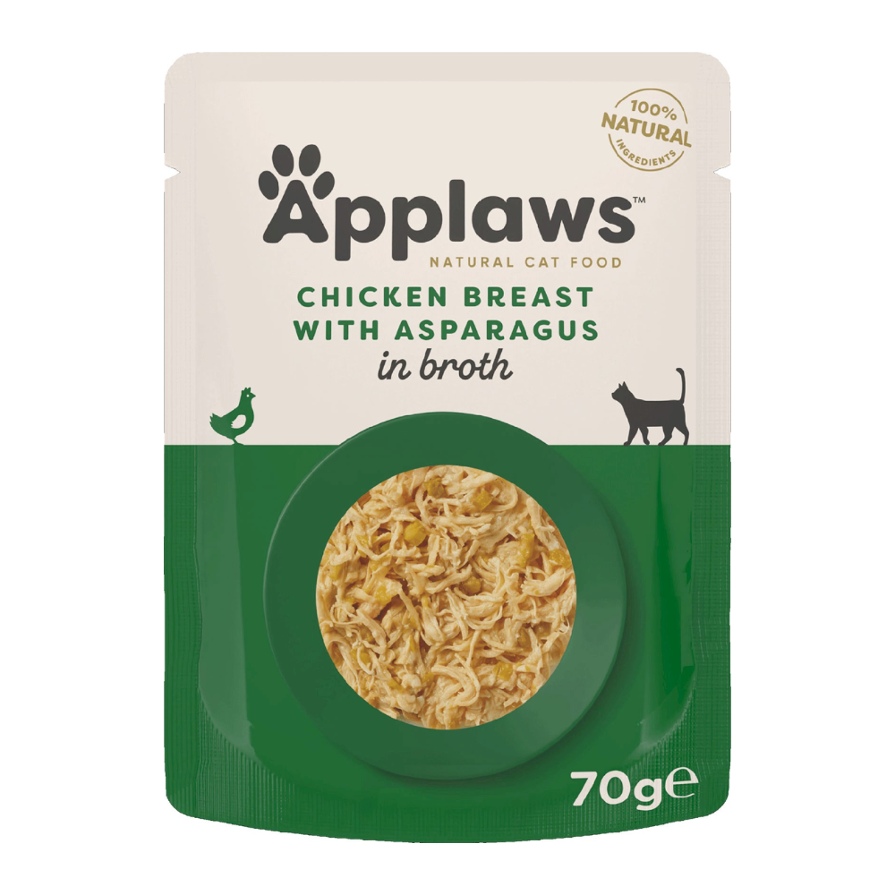 A 100% natural complementary wet food pouch for adult cats. Made with 70% chicken breast, chicken broth, 5% asparagus, and 2% rice. Contains no artificial colours, flavours, or preservatives. Formulated to be low in carbs, high in protein, and rich in moisture for hydration, lean muscle support, and overall wellbeing.