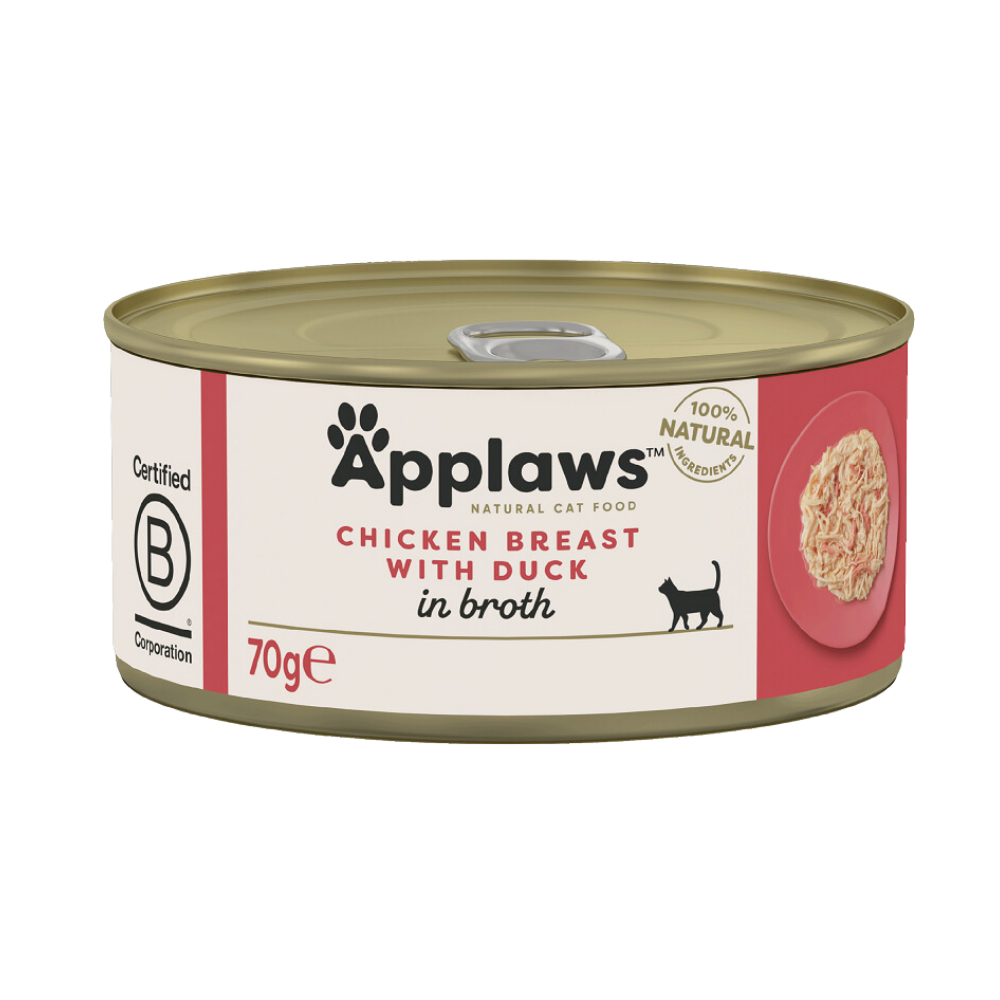 Applaws Chicken Breast with Duck in Broth 70g is a 100% natural complementary wet food for adult cats, made with only 4 simple ingredients. Crafted with 70% chicken breast, 5% duck, rice, and savory broth, it delivers high-quality protein and animal flavours cats crave. Free from artificial colours, flavours, preservatives, or carrageenan. Naturally rich in taurine and omega-6 fatty acids to support heart, vision, skin, and coat health. Perfect as a meal topper or occasional feed.