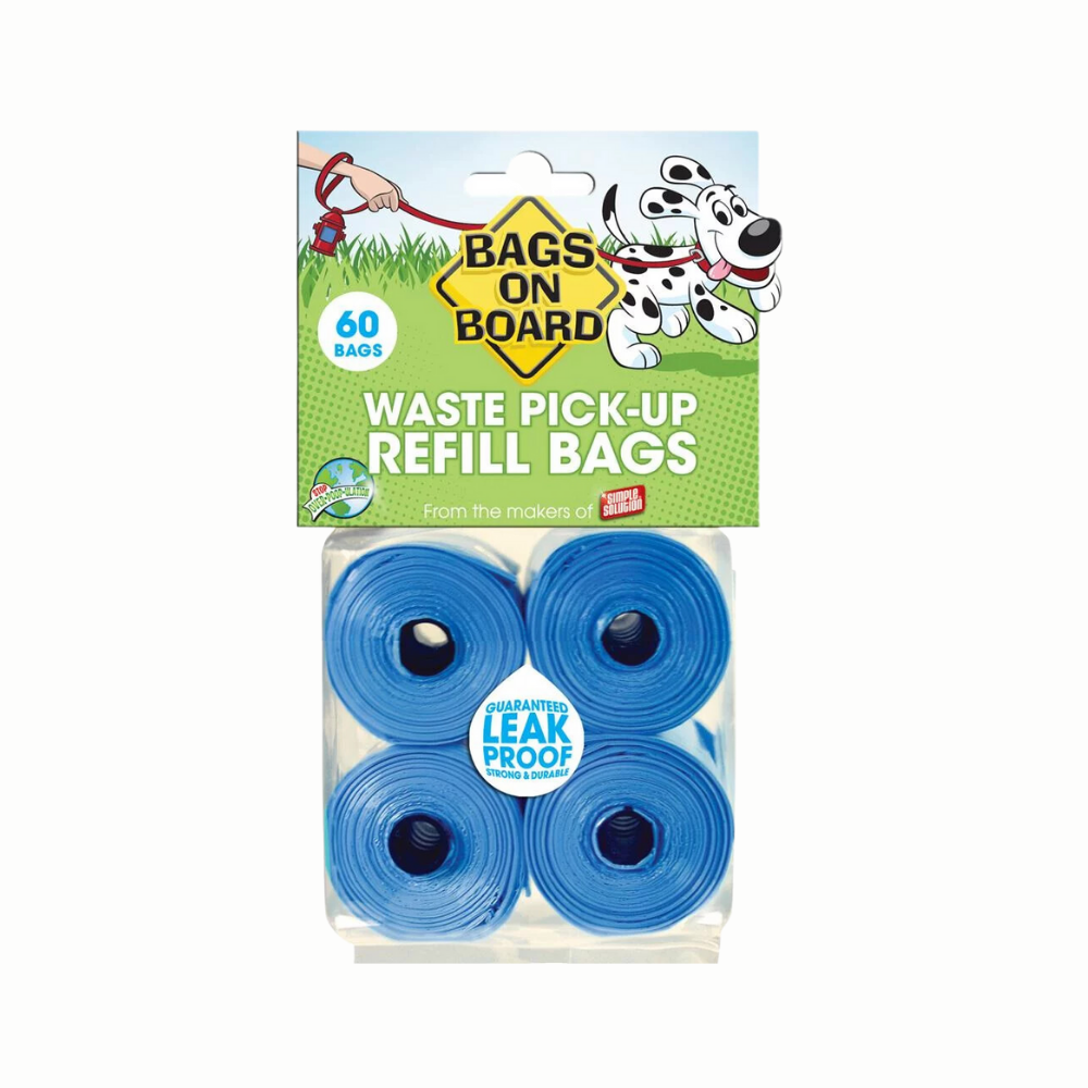 Restock your dispenser with Bags on Board Blue Refill Bags 60 pcs, designed for seamless compatibility and leak-proof performance. These strong, double-sealed bags measure 9 × 14 in (22.9 × 35.6 cm) and come in classic blue. Each bag is crafted to resist tearing and leaks, ensuring reliable waste pickup during daily walks or outings. The refill pack splits into 4 rolls of 15 bags each, making replacement easy and organized. Fits all Bags on Board dispensers—no need to buy a new one.
