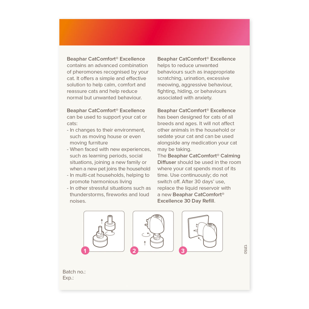 Remove the cap from the refill and screw it into the diffuser unit. Plug the diffuser into a power socket in the room your cat frequents most. Leave the diffuser switched on continuously for best results. Replace the refill every 30 days as needed.