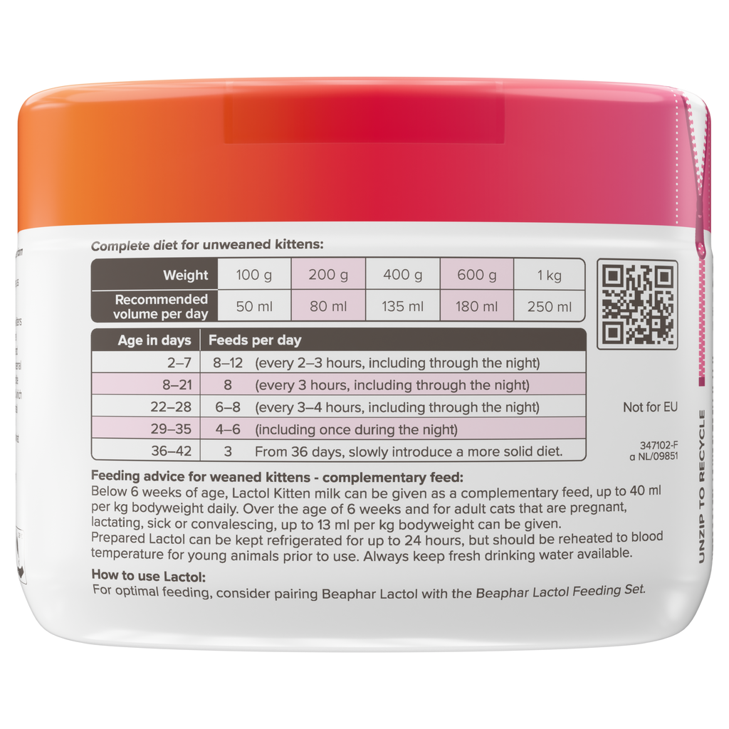 Dissolve the recommended amount of Lactol powder in warm, boiled water (~38 °C), stir until fully dissolved. Allow to cool to lukewarm before feeding. Use clean feeding bottles or syringes. Refrigerate any unused prepared milk for up to 24 hours and reheat before feeding. For weaning, gradually mix Lactol with kitten food, reducing milk as solid food increases.
