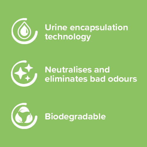 Special encapsulating compounds to trap ammonia, enzyme complexes to break down organic odours, biodegradable base materials, and fragrance oils (Vanilla & Melon or Orchid).