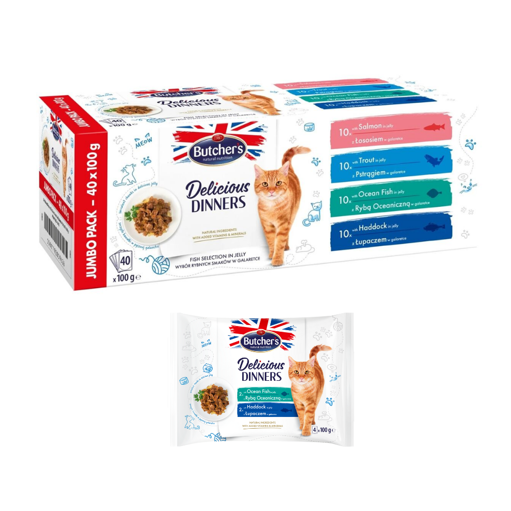 Butcher's Delicious Dinners Jumbo Pack Food For Cats Fish Selection Salmon/Ocean Fish/Trout/Haddock In Jelly 40X100G