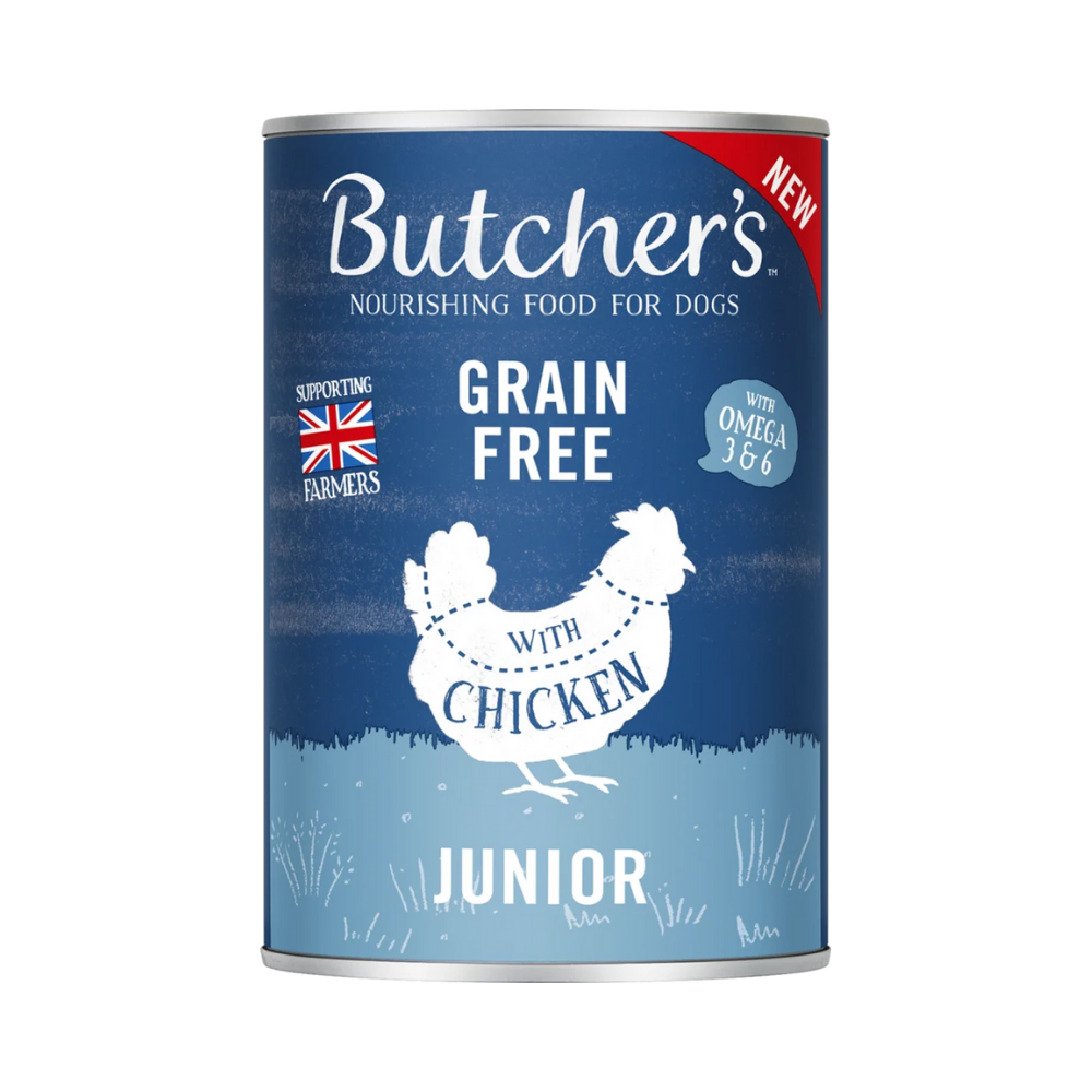 Butcher’s Original Junior Chicken 400g is a grain-free complete & balanced wet dog food crafted for puppies. Made with 40% chicken, 6% beef, 4% chicken liver, and enriched with salmon oil, it delivers high-quality protein, DHA, and prebiotics to support healthy growth, strong muscles, immune function, and brain development. With just 8% crude protein and 6% fat in an 82% moisture recipe, it’s gentle on young stomachs and perfect for daily puppy feeding.