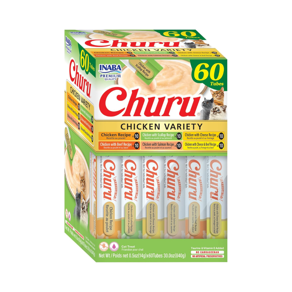 Churu Chicken Vairety 60 x14gAn excellent snack for your cat, offering a variety of foods made from chicken in different flavours. These meals include a delicious blend of proteins and essential nutrients your cat needs to stay healthy and active.Each sachet contains a different flavored pureed chicken meal, providing a pleasant taste experience for your cat and adding variety to her daily meals. You can offer these meals as a reward for your cat or as a snack between main meals.