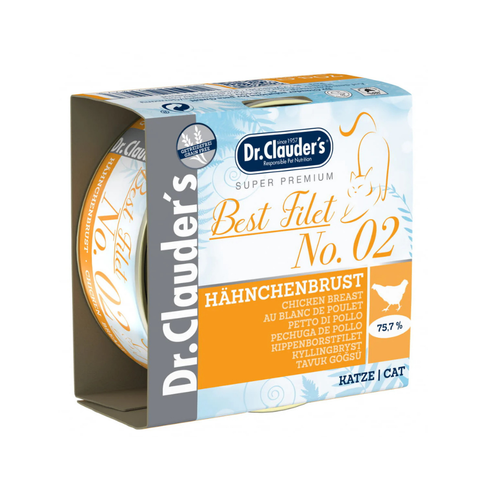 Dr. Clauder’s Best Filet No.2 Chicken 70g is a light, grain-free wet treat made with 75.7% chicken breast, 23.3% broth, and 1% potato starch. With just 80 kcal per 100g, it’s perfect as a snack or reward alongside dry food. Rich in protein and containing vitamin B3 to support metabolism, it’s free from preservatives and flavour enhancers. With its soft texture and mild taste, it’s ideal for cats who appreciate real chicken goodness.