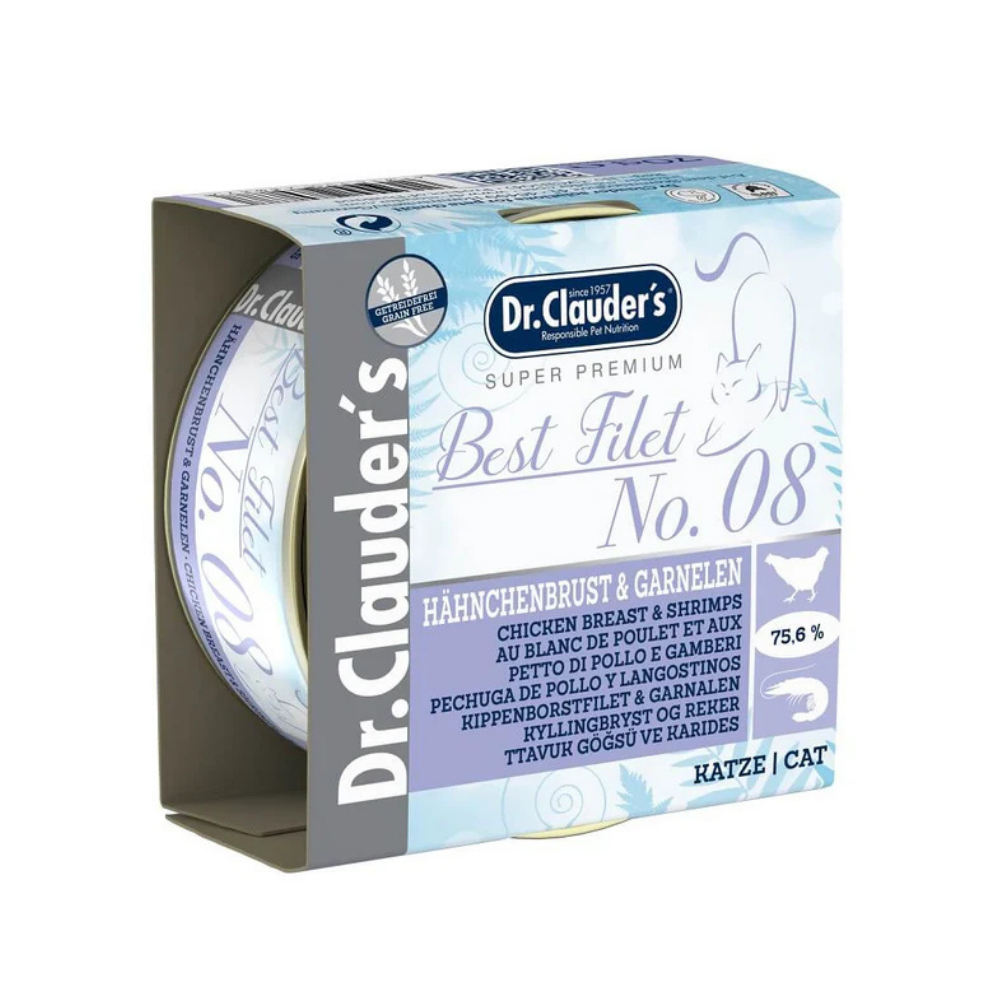 Dr. Clauder’s Best Filet No.8 Chicken & Shrimps for Cats 70g is a premium grain-free wet food crafted with tender chicken fillet and tasty shrimps for a protein-rich recipe. With over 75% meat and seafood, it delivers high-quality animal protein to support lean muscles, energy, and overall vitality. Low in fat and free from preservatives or flavor enhancers, this recipe is gentle on digestion while offering a soft texture and an irresistible flavor combination cats love.