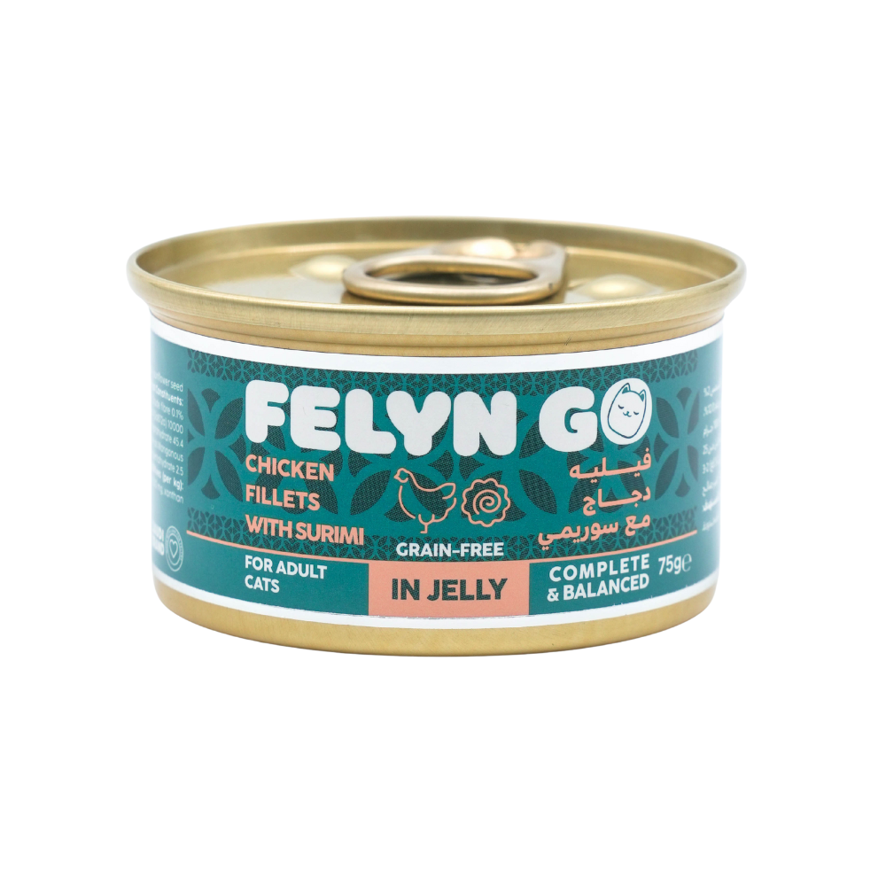 Felyn Go Chicken Fillets with Surimi in Jelly is a complete and balanced wet meal made with 51% chicken broth, 42% chicken breast, 3% surimi, 2% sunflower seed oil, and 0.1% fructo-oligosaccharide to promote healthy digestion; this grain-free recipe provides up to 85.0% moisture for hydration, 12.0% crude protein for muscle maintenance, 1.8% crude fat for energy, 2% ash and 0.1% crude fibre for balanced nutrition, delivering approximately 75.02 kcal per 100 g, offering tender fillets with a flavorful twist and nourishing texture in every portion.