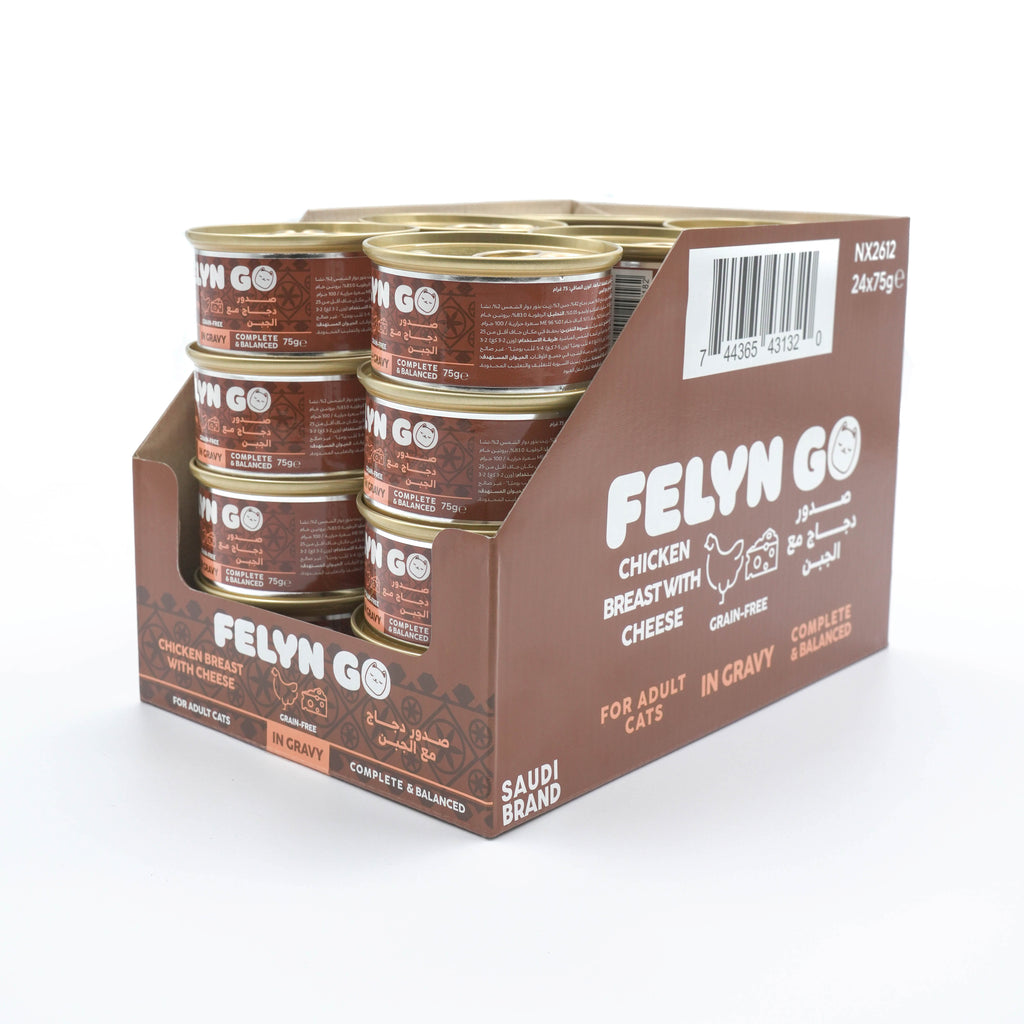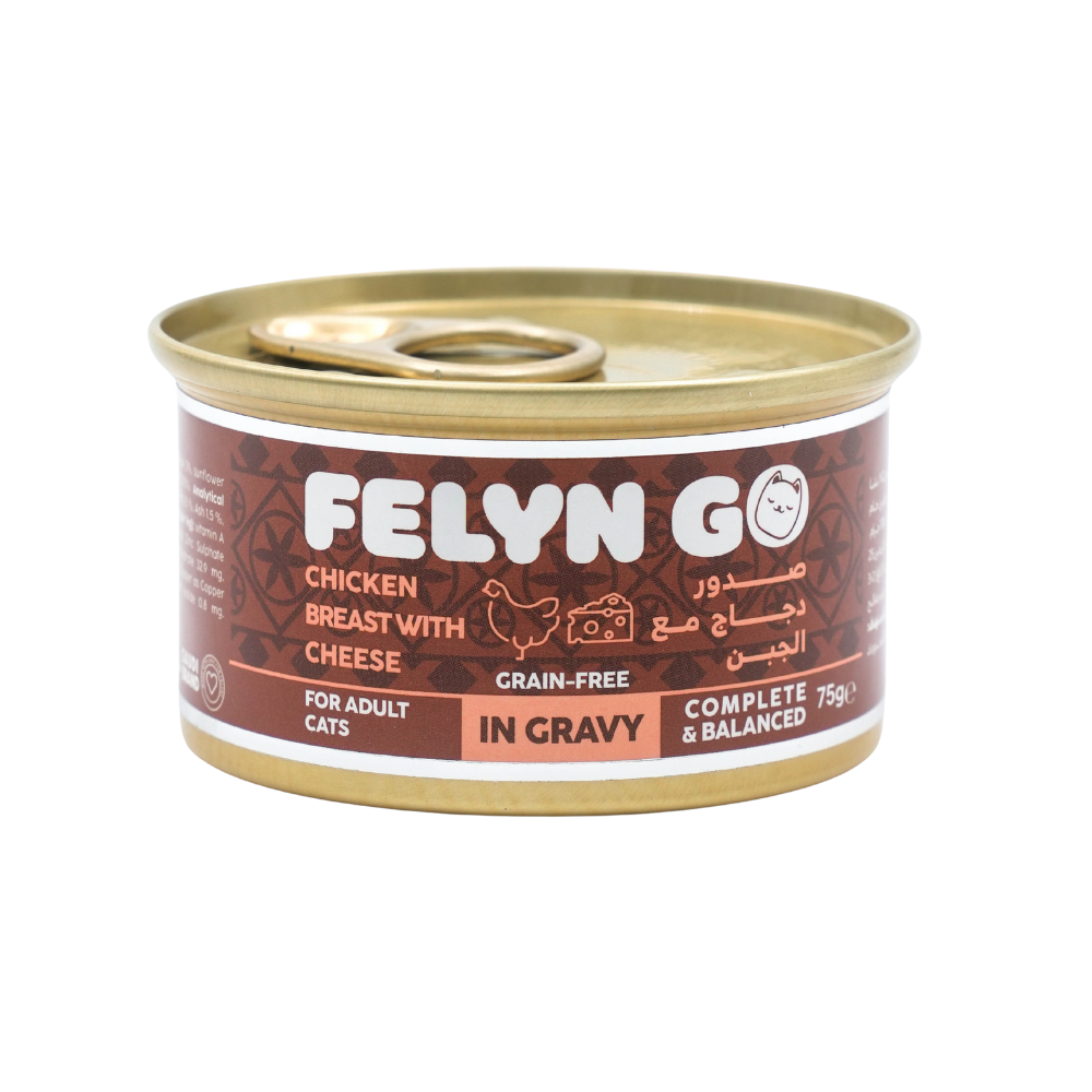 Felyn Go Complete & Balanced Chicken Breast with Cheese in Gravy 75g is a nutritious wet cat food made with tender chicken breast and creamy cheese in a savory gravy. Formulated as a complete & balanced diet, it provides essential protein, vitamins, and minerals for daily health. Enriched with sunflower seed oil for a healthy skin and coat, tapioca starch for texture and energy, and FOS prebiotics for digestion, this recipe supports muscles, vitality, and overall wellbeing. Deliciously rich and satisfying, it’s a flavor cats will love.