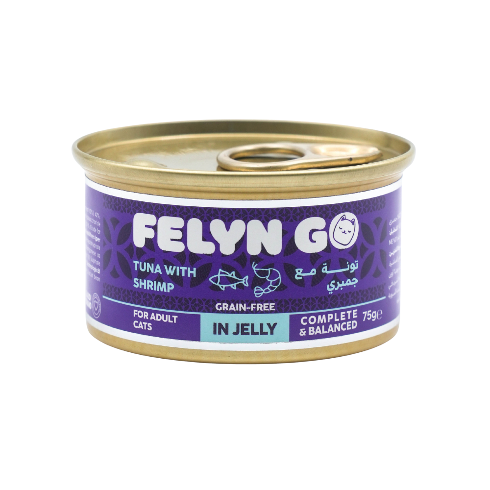 Felyn Go Complete & Balanced Tuna with Shrimp in Jelly 75g is a nutritious wet cat food crafted with tender tuna and tasty shrimp in a flavorful jelly. Formulated as a complete & balanced diet, it provides essential protein, vitamins, and minerals to support daily health. Rich in animal protein, it helps maintain lean muscles, energy, and overall vitality. Gentle on digestion and free from artificial colors and preservatives, this recipe ensures wholesome daily nutritionwith an irresistible seafood flavor cats love.