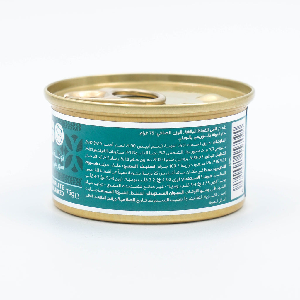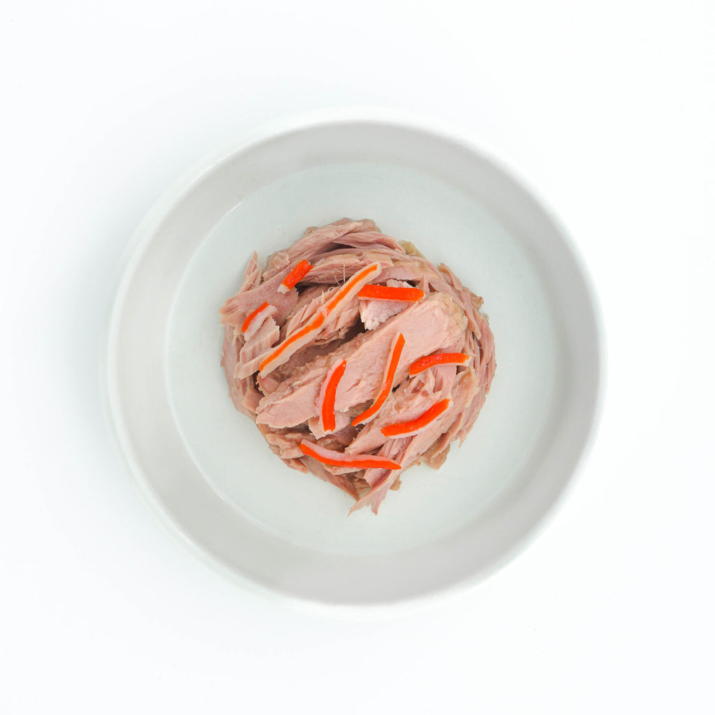 Ingredients: 51% fish broth, 42% tuna, 3% surimi, 2% sunflower seed oil, 0.1% fructo-oligosaccharide.