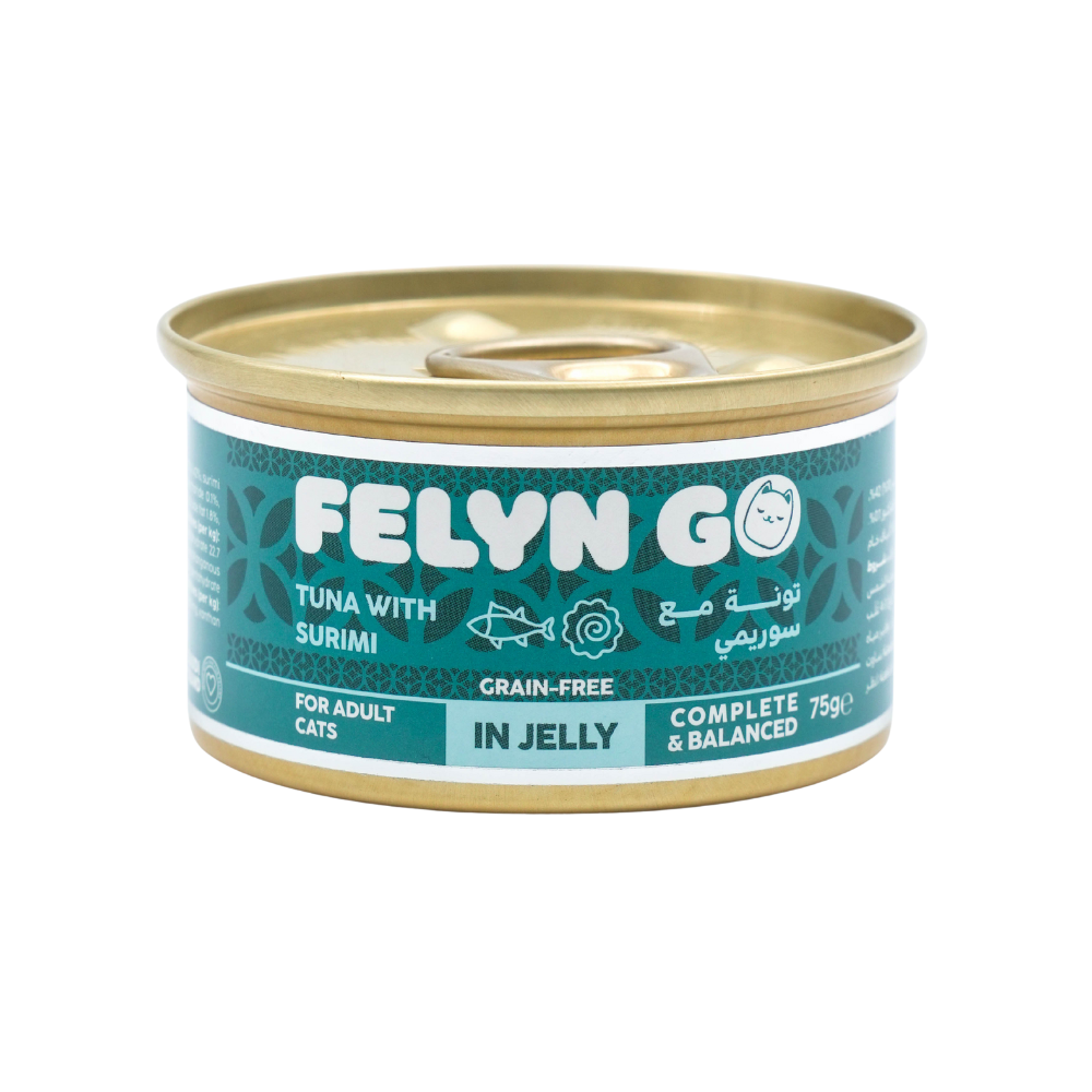 Felyn Go Complete & Balanced Tuna with Surimi in Jelly 75g is a nutritious wet cat food crafted with tender tuna and tasty surimi in a soft jelly. Formulated as a complete & balanced diet, it provides essential protein, vitamins, and minerals for everyday health. Rich in animal protein, it supports lean muscles, energy, and overall vitality. Enriched with sunflower seed oil for skin and coat health and FOS prebiotics for gentle digestion, this recipe delivers wholesome daily nutrition with an irresistible seafood flavor.