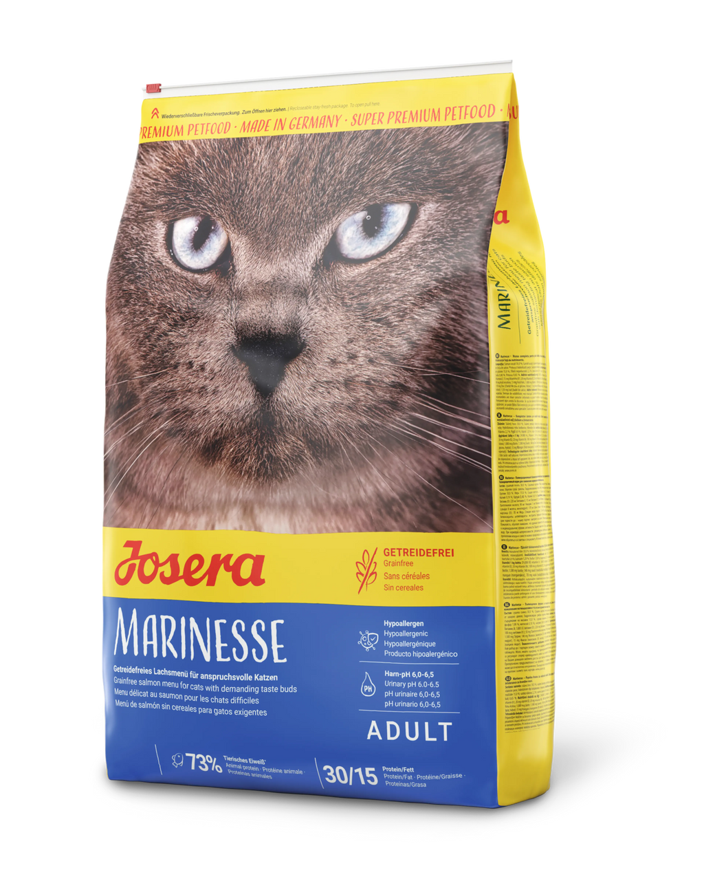 Josera Marinesse is a dry food crafted for adult cats who love fish or suffer from food intolerances. Its grain-free, hypoallergenic formula uses well-tolerated protein sources to support gentle digestion, healthy skin and a shiny coat without triggering sensitivities.