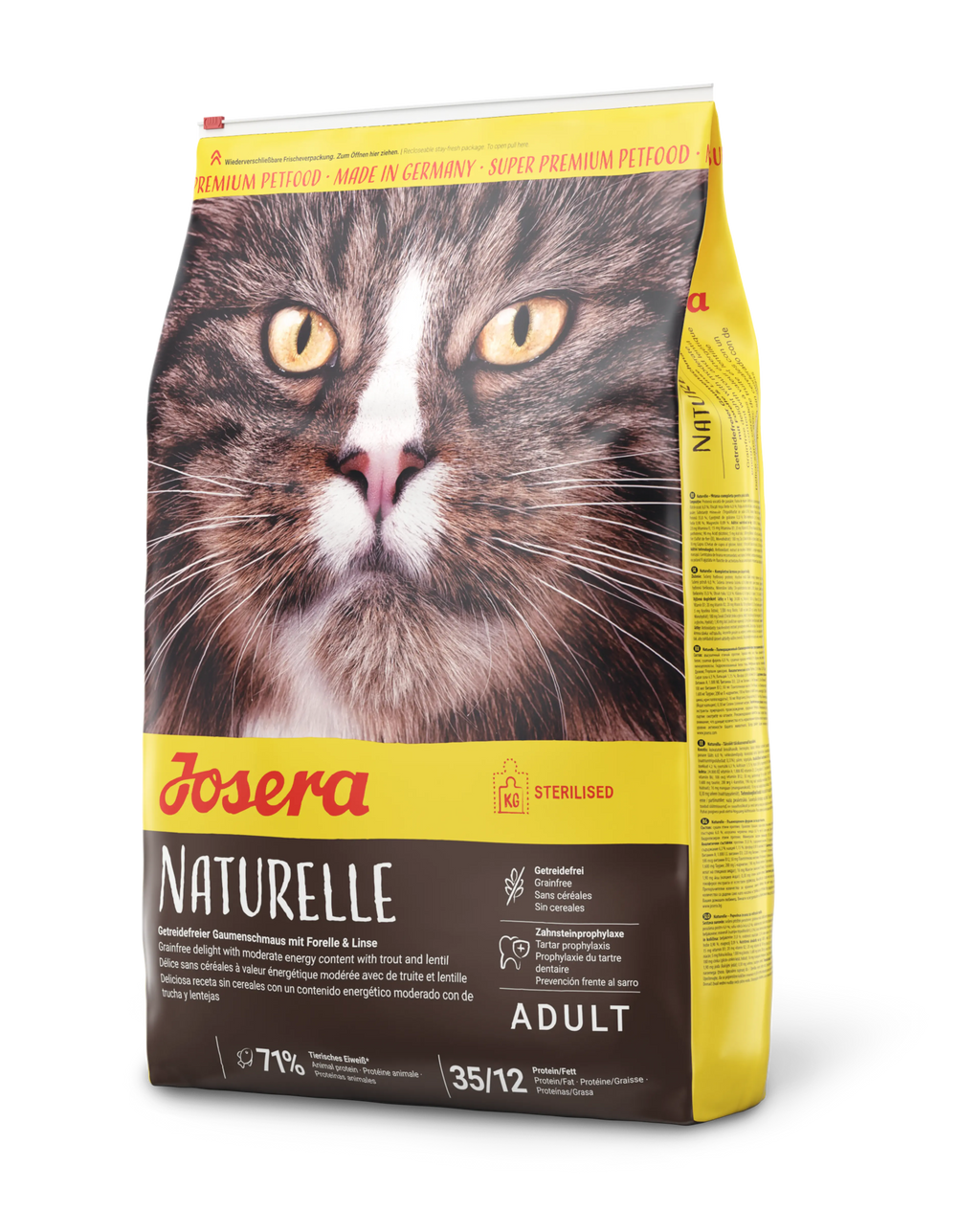 Josera Naturelle is formulated for sterilized adult cats, especially those that are sterilised or indoor and need moderate energy. This grain-free, complete food features trout and lentil, offering high-quality animal and plant proteins, paired with moderate fat content to help prevent weight gain. It supports urinary health by promoting a pH of ~6.0-6.5, reducing risk of urinary stone formation.