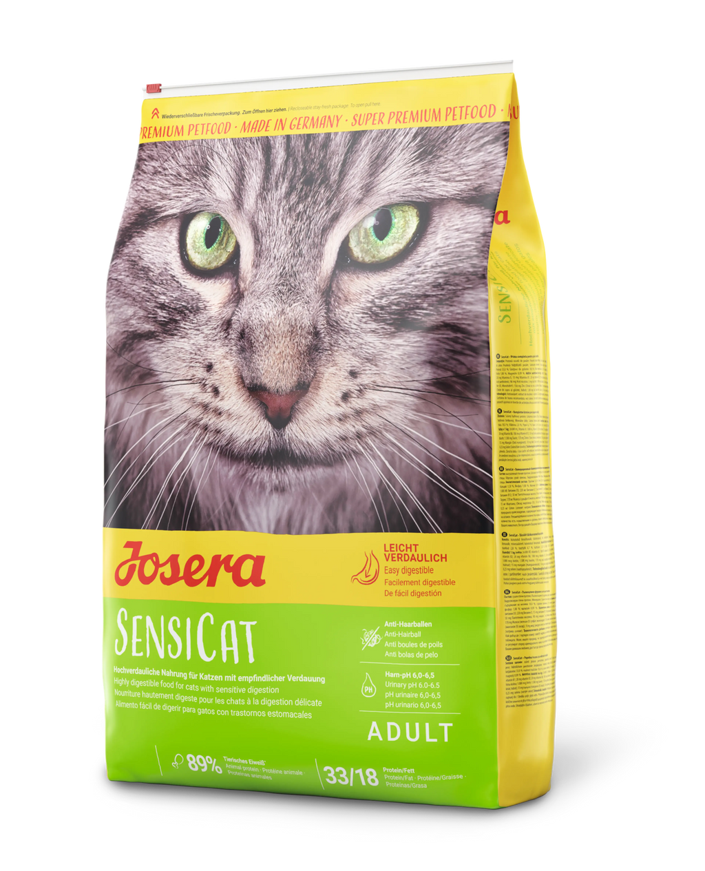 Josera SensiCat is a dry food for adult cats (also suitable for kittens from 6 months old) that have sensitive digestion or dietary tolerances. It uses easily digestible ingredients to support gut health, while dietary fibre helps reduce hairball formation.