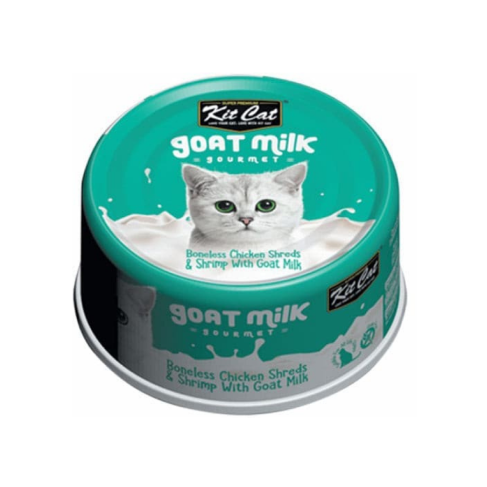 Kit Cat Boneless Chicken Shreds & Shrimp with Goat Milk 70g is a grain-free wet cat food perfect for cats with sensitive stomachs. Made with fresh boneless chicken, shrimp, and goat milk powder, plus taurine and vitamin E, it supports lean muscles, immune health, and helps reduce mucous and inflammation. Naturally high moisture content helps with hydration; free from artificial colours and preservatives.