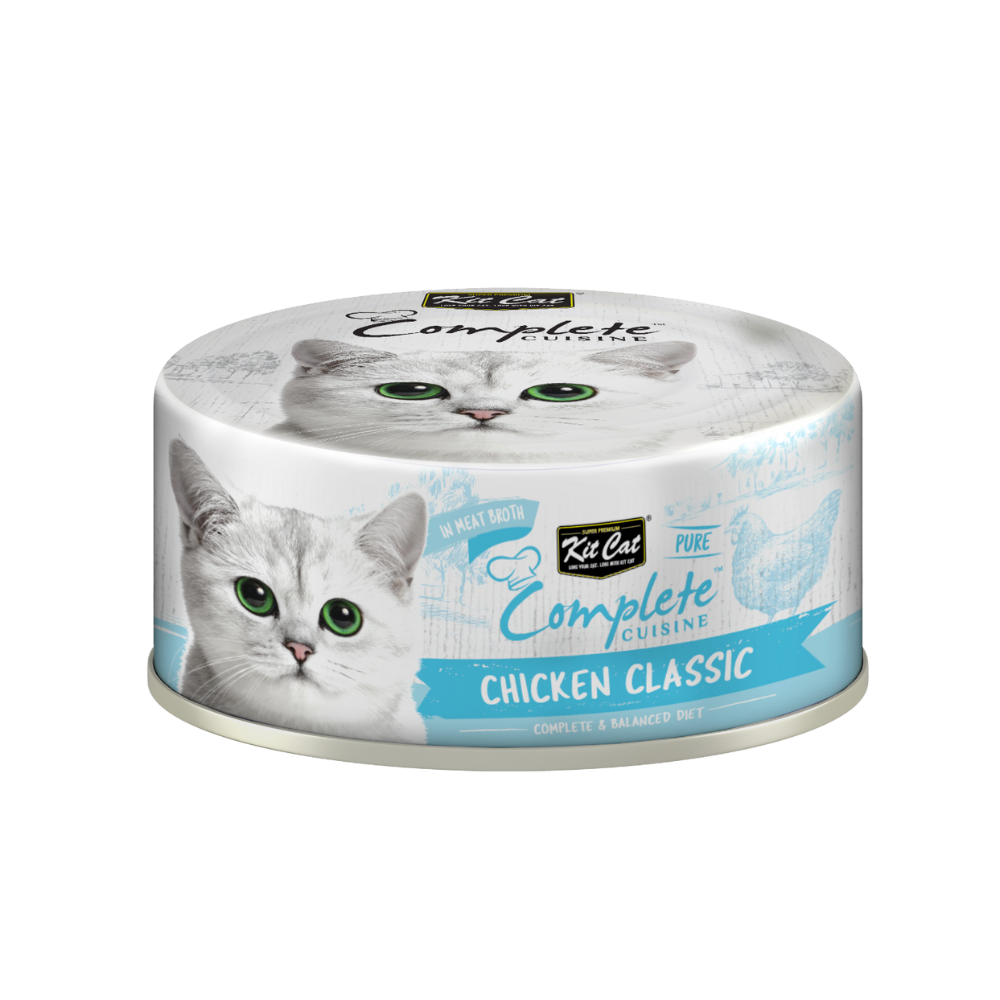 Kit Cat Complete Cuisine Chicken Classic 70g is a premium grain-free wet cat food made with tender chicken fillet in a light broth. Formulated as a complete and balanced diet, it provides essential animal protein, vitamins, and mineralsto support lean muscles, immunity, and overall vitality. Enriched with taurine for heart and eye health, this recipe is gentle on digestion and free from artificial colors or preservatives, ensuring daily nutrition with a taste cats will love.