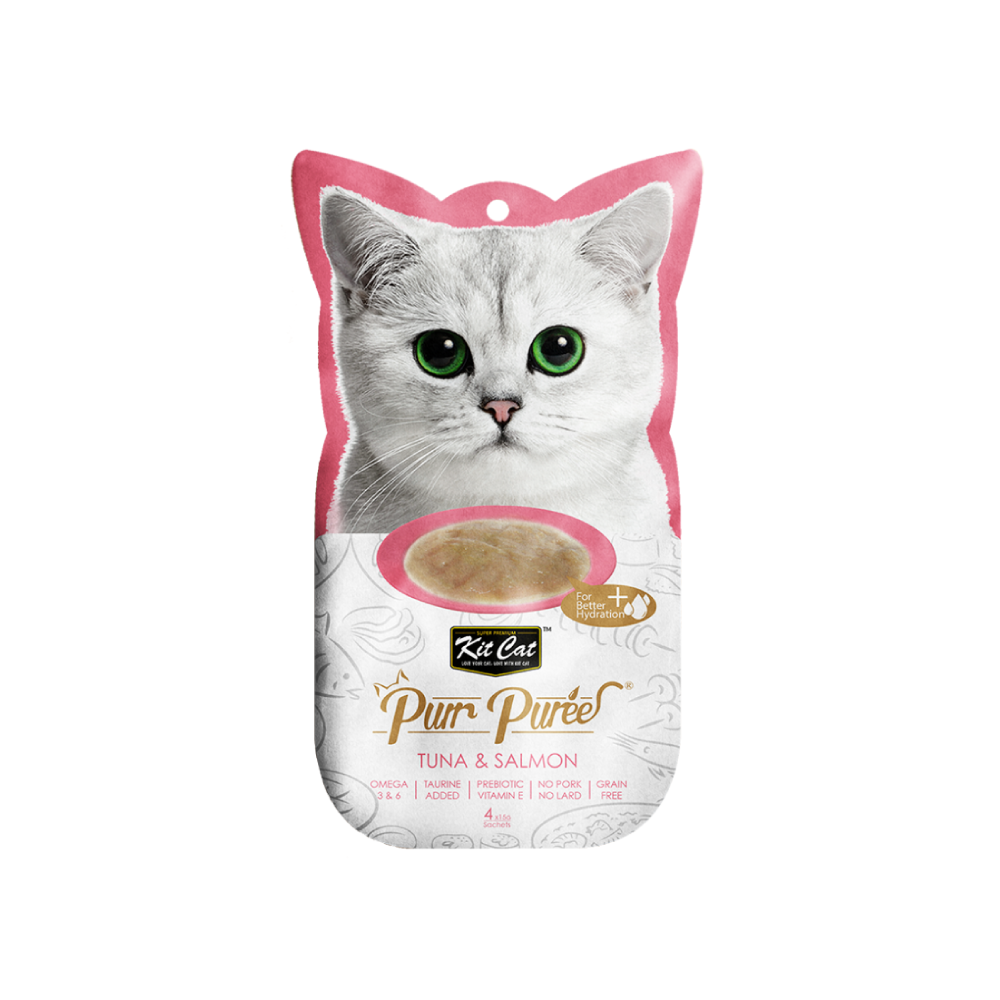 Kit Cat Purr Puree Tuna and Salmon is a creamy and functional snack for cats from 2 months of age. Perfect to reward your cat and complement its diet. This recipe is made with the best tuna and the best salmon, cleaned and boned and cooked over low heat to obtain a smooth puree with an intense flavor.This recipe is made from oily fish, rich in Omega 3, excellent for your cat's development. With no added colors or preservatives and is perfect for cats of all life stages. Grain-free, delicious and 100% natural. With Omega 3 and 6, added Taurine, prebiotic Vitamin E. No pork, no lard.