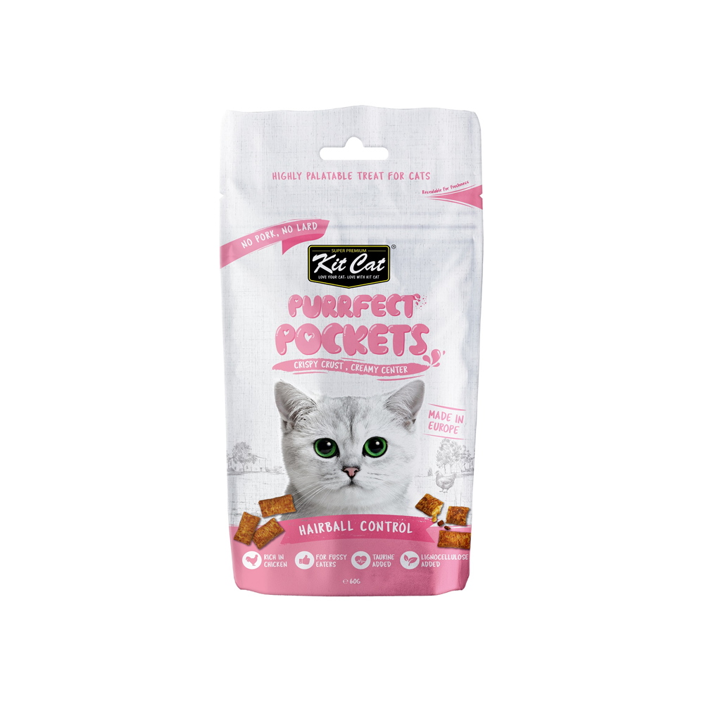 Reward your cats with Kit Cat Purrfect Pockets featuring a duo texture treat made withnatural ingredients that guarantees satisfaction with every bite. Featuring a crispy exteriorthat brings a fun crunch and a soft center that oozes with deliciousness, look forwardto this nutritional reward loaded with drool-worthy flavours. Perfect for even the fussiesteaters, get ready for a whole new treat experience with this tantalising range.Highly Palatable TreatsCrispy Crust Creamy InsideTaurine AddedLignocellulose Added