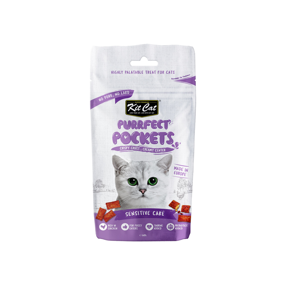 Reward your cats with Kit Cat Purrfect Pockets featuring a duo texture treat made withnatural ingredients that guarantees satisfaction with every bite. Featuring a crispy exteriorthat brings a fun crunch and a soft center that oozes with deliciousness, look forwardto this nutritional reward loaded with drool-worthy flavours. Perfect for even the fussiesteaters, get ready for a whole new treat experience with this tantalising range.Highly Palatable TreatsCrispy Crust Creamy InsideTaurine AddedLignocellulose Added