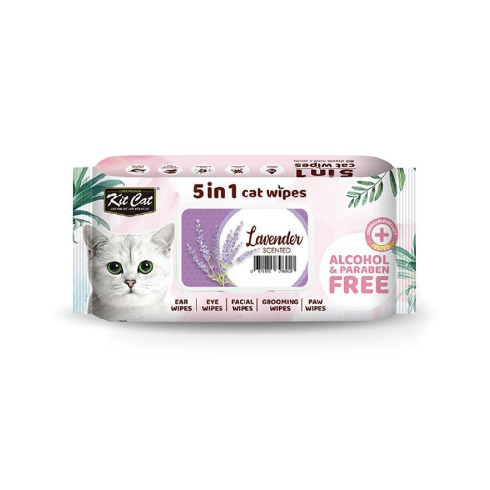 Kit Cat Wet Wipes 5-in-1 Lavender Scented 80pcs are gentle, alcohol-free wipes designed to keep your pet clean and fresh. Infused with a soothing lavender scent, they provide five key benefits: cleansing, deodorizing, moisturizing, antibacterial care, and coat conditioning. Made with aloe vera extract and vitamin E, they are safe for daily use on cats and dogs, even around paws, faces, and bottoms. Convenient and durable, these wipes are perfect for quick clean-ups at home or on the go.