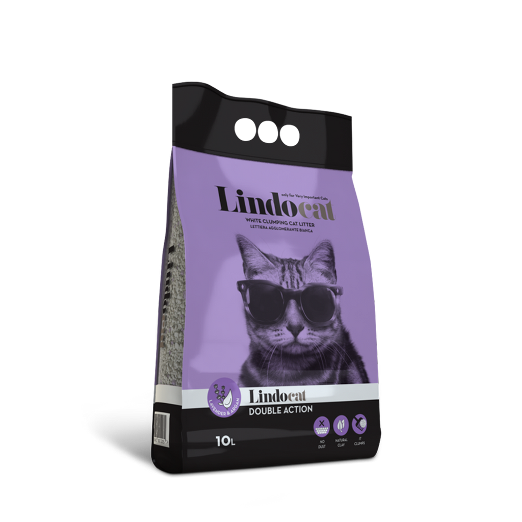 Lindocat Double Action is made from 100% white bentonite clay with purple granules, offering excellent clumping power and efficient absorption of liquids and odours.