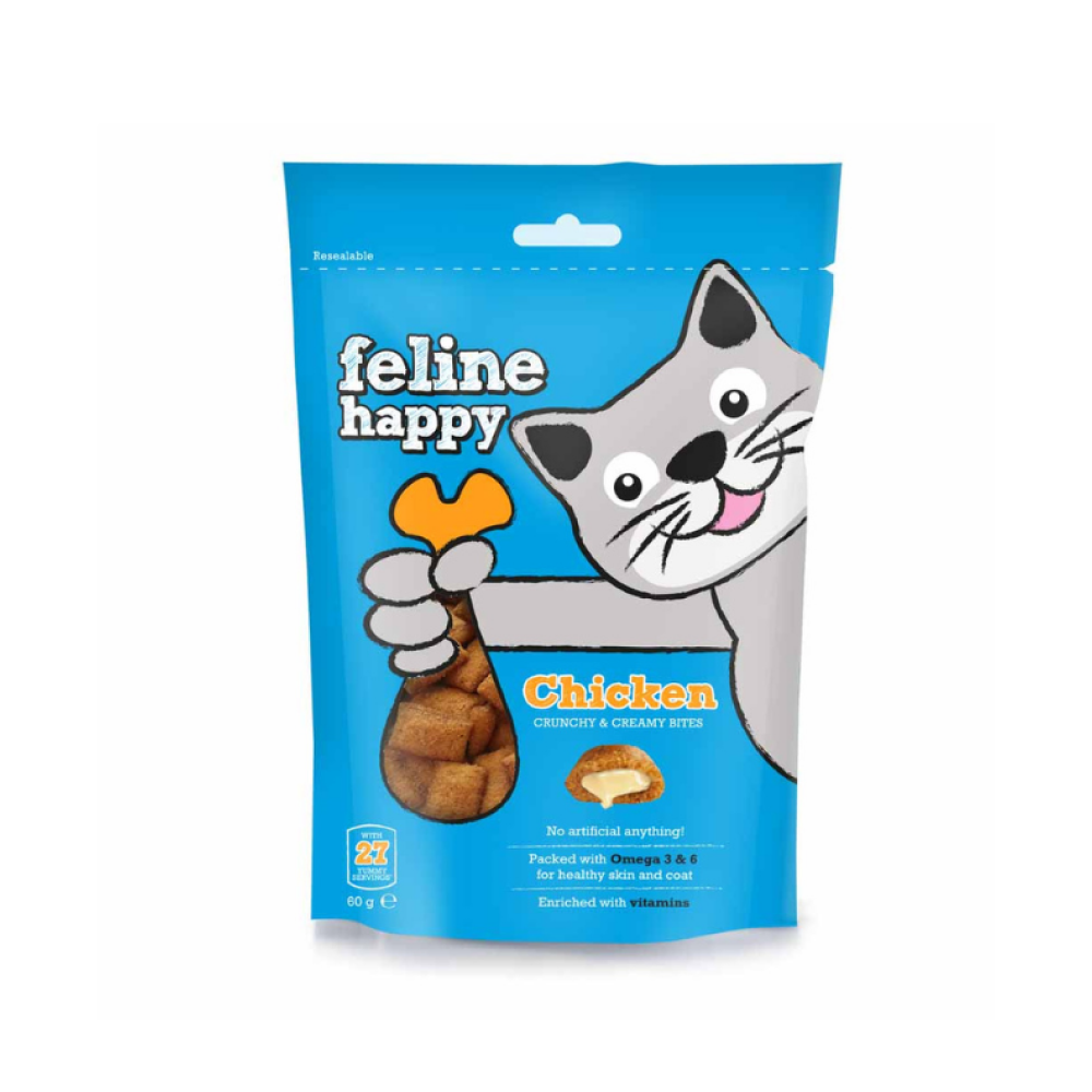 MC Feline Happy Chicken 60gFeline Happy Treat is made from healthy ingredients and without any artificial ingredients, making it delicious and healthy at the same time!Each piece consists of a crispy shell and is filled with a delicious soft cream inside.Without any artificial ingredientsCrispy and creamy filled with real chickenContains healthy canola oil, a source of Omega 3 and 6Each piece contains less than 2 calories