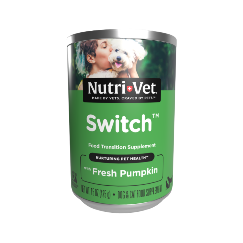 Nutri-Vet's Switch food transition supplement for dogs and cats is made with fresh pumpkin. This food topper helps prevent stomach upset, gas and diarrhea during the transition to a new food.