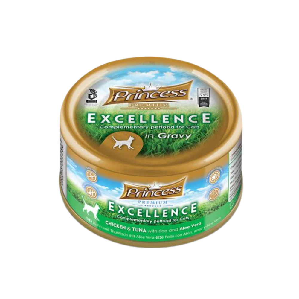 Princess Premium Excellence Chicken and Tuna with Rice & Aloe Vera 70g is a premium wet food made with tender chicken breast and tuna, enriched with aloe vera and rice for gentle digestion and natural nourishment. Packed with animal protein, vitamins, and minerals, it supports lean muscles, energy, and overall vitality. Free from fillers and artificial additives, this recipe provides balanced daily nutrition with a soft texture and unique flavor combination cats love.