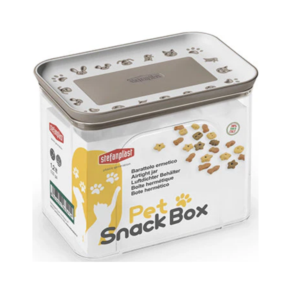New plastic pet snack box, equipped with a rubber airtight closing to stock up on food and keep it fresh and crispy. Dimensions: cm 10x15,5x12h3,9"x6,1"x4,7"hColours: White/English GreenBC01/VD66