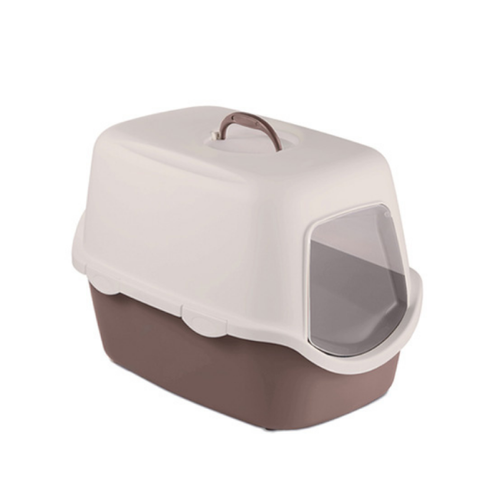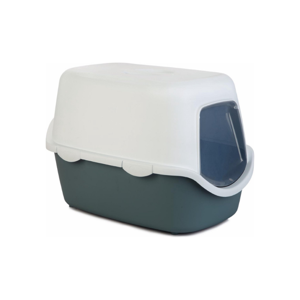 Quick, and easy to assemble hooded cat toilet. Dimensions: cm 56x40x40h22"x15,7"x15,7"hColours: White/Steel blueBC01/AZ18