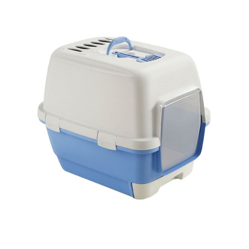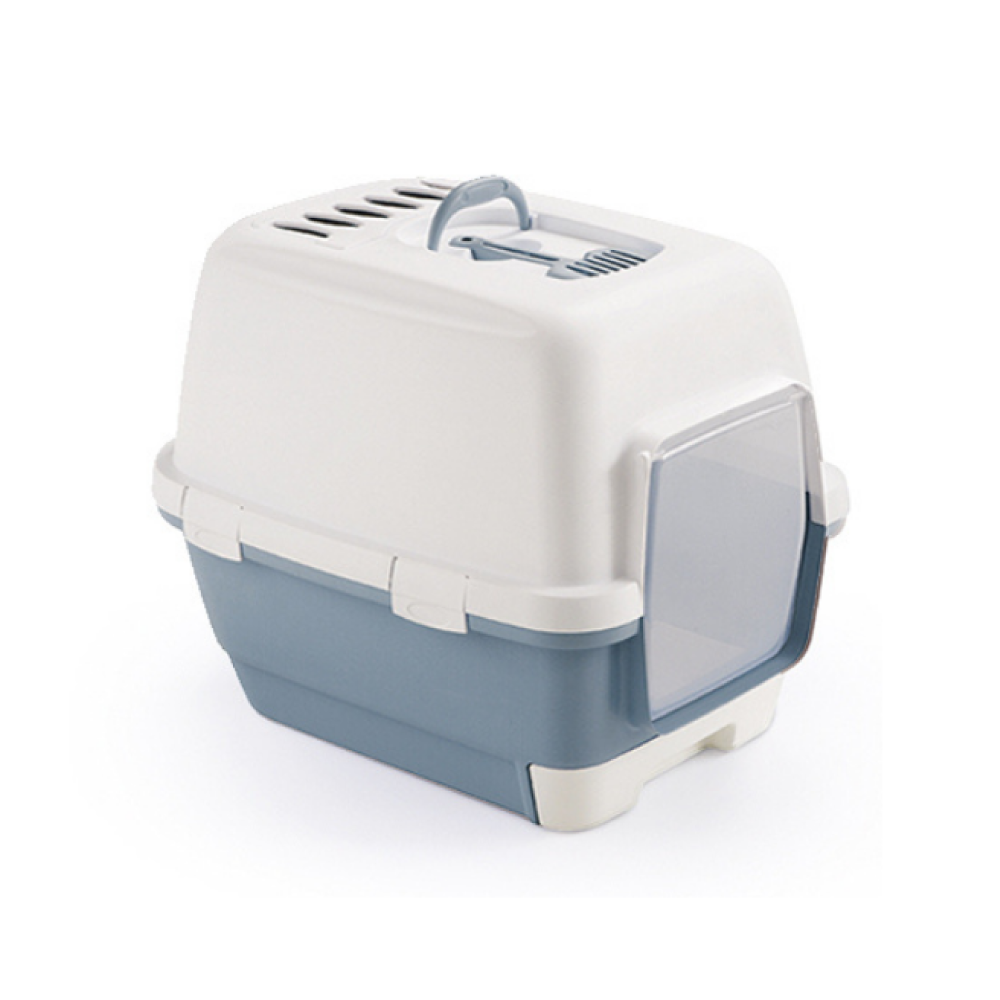 Hooded cat toilet with pull-out drawer, hygienic scoop and carbon filter, dimensions : cm 58x45x48h22,83"x17,71"x18,9"hColours: White/Steel blue