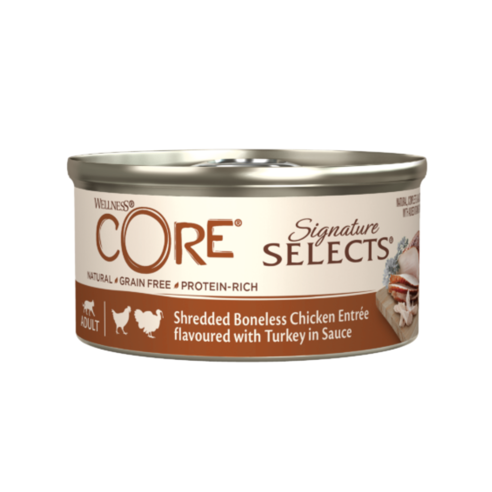 Wellness CORE Signature Selects Shredded Chicken & Turkey in Sauce 79g is a premium grain-free wet food made with tender shreds of real chicken and turkey in a savory sauce. Rich in high-quality animal protein, it supports lean muscles, energy, and overall vitality. Enriched with taurine, vitamins, and minerals, it promotes heart health, immunity, and daily wellbeing. Naturally hydrating and free from artificial colors, flavors, and preservatives, this recipe provides balanced daily nutrition with a taste cats will love.